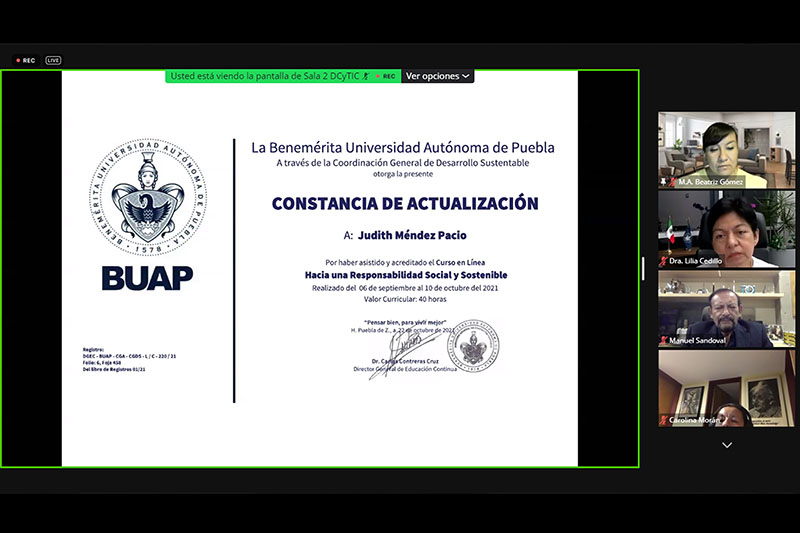 Por ello, la doctora Cedillo Ramírez agradeció el interés de los organizadores, los titulares de la Coordinación de Gestión Ambiental, Diego Ariel Riva, y de la Coordinación General de Desarrollo Sustentable, Manuel Sandoval Delgado, así como de investigadores y estudiantes del Instituto de Ciencias (ICUAP) y de su directora Carolina Morán Raya, quienes tomaron el curso virtual “Hacia una responsabilidad social y sostenible”, en el cual se abordaron 15 temas, en cuatro módulos, del 6 de septiembre al 10 de octubre.