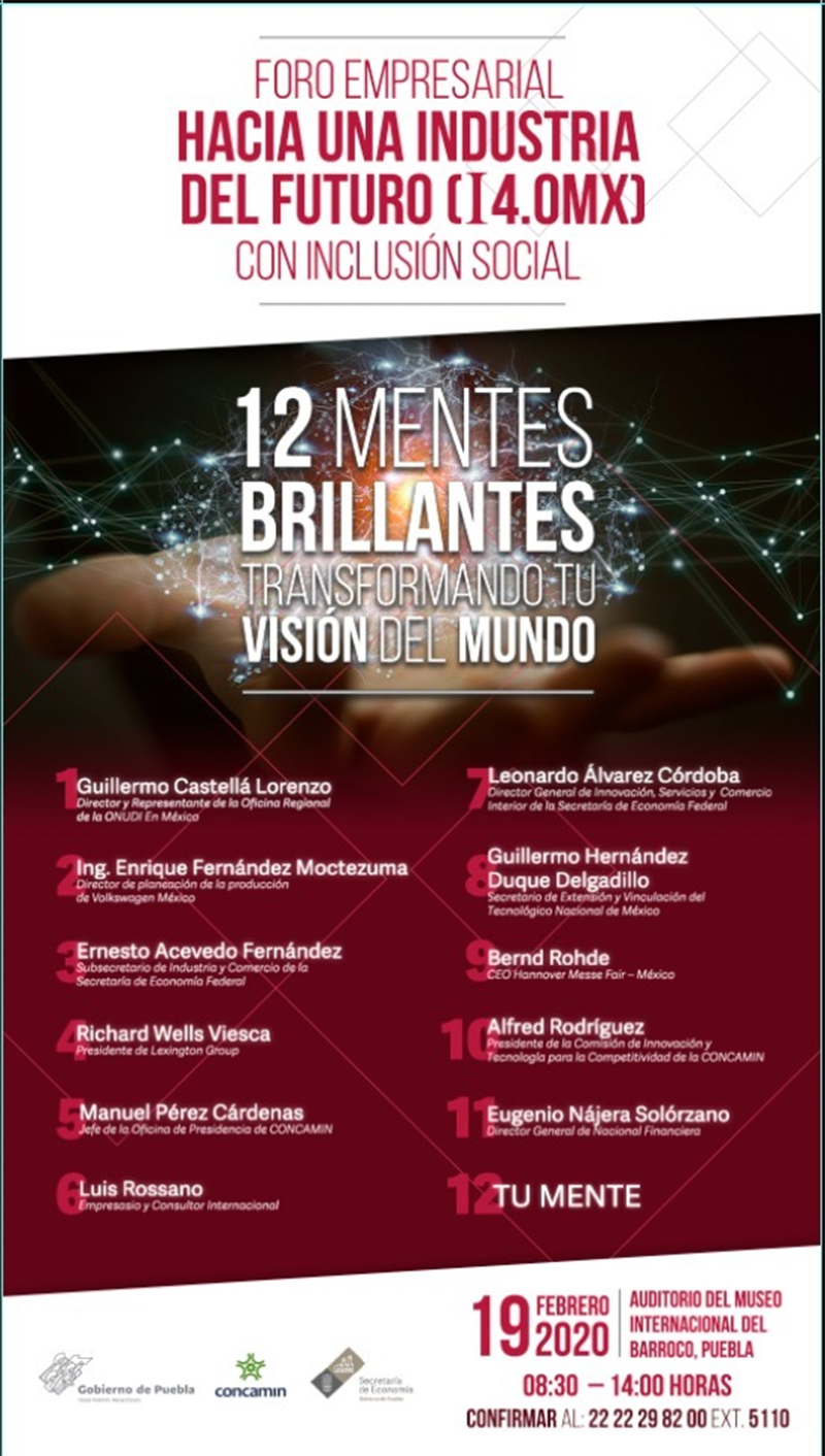 La Confederación Nacional de Cámaras Industriales de los Estados Unidos Mexicanos (Concamin) y la Secretaría de Economía del Gobierno del Estado confirmaron la relación de ponentes que participarán en el Foro Empresarial “Hacia una industria del Futuro (i4.0 Mx) con inclusión social”, el próximo miércoles 19 de febrero, con el objetivo conformar un ecosistema de información para el desarrollo del Sur-Sureste del país.