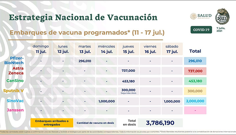 Para continuar la Estrategia Nacional de Vacunación, del 13 al 17 de julio se prevé recibir tres millones 786 mil 190 dosis de vacunas envasadas de cinco farmacéuticas: Pfizer-BioNtech, AstraZeneca, CanSino, Sinovac y Centro Nacional de Epidemiología y Microbiología, que produce Sputnik V, refiere el Informe Técnico covid-19 de este día.