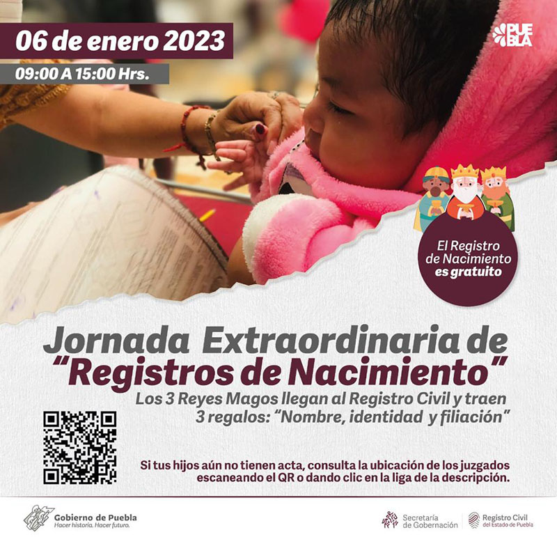 Para dotar de identidad jurídica y social a todas las y los poblanos, el Gobierno del Estado, a través de la Secretaría de Gobernación (Segob), llevará a cabo este 6 de enero una jornada extraordinaria de registros de nacimiento, dirigida a padres de familia que por alguna razón no han realizado este trámite gratuito para sus hijas e hijos; las y los interesados deberán asistir a la oficina del Registro Civil más cercana e iniciar el procedimiento para obtener este documento.