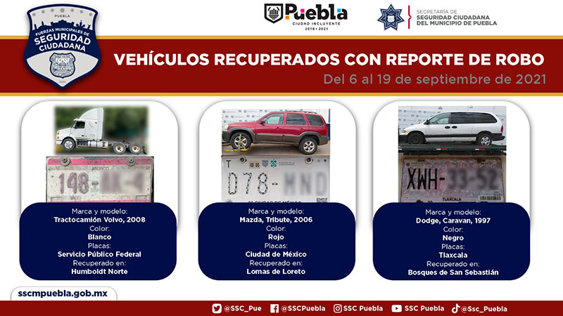 Derivado del fortalecimiento de acciones contra el robo de vehículo, la Secretaría de Seguridad Ciudadana (SSC) del Municipio de Puebla reportó la recuperación de siete automóviles, en el periodo comprendido del 6 al 19 de septiembre del presente año.