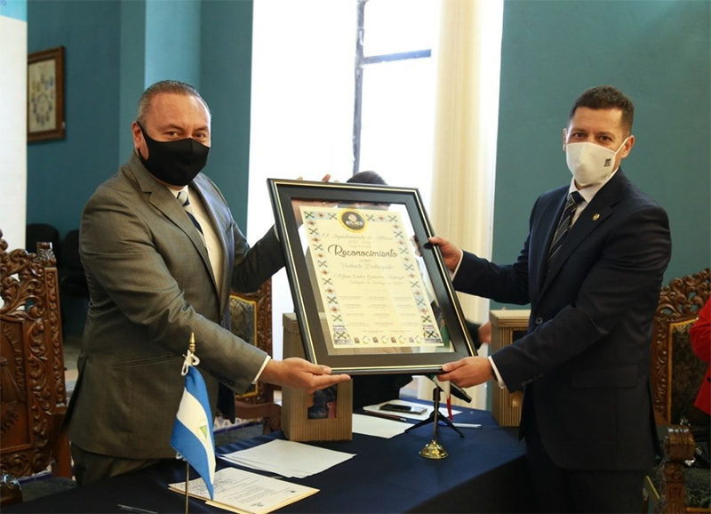 Durante el recorrido del embajador de Nicaragua por el municipio de Atlixco, el edil Guillermo Velázquez Gutiérrez otorgó el reconocimiento de “visitante distinguido” a Juan Carlos Gutiérrez Madrigal.
