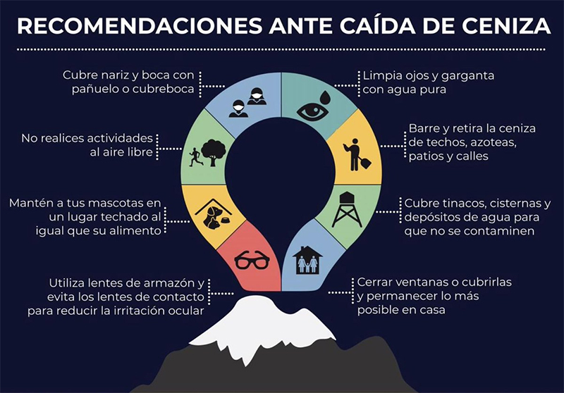 Se recuerda que en caso de caída de ceniza se debe cubrir nariz y boca con pañuelo o cubreboca, limpiar ojos y garganta con agua pura, utilizar lentes de armazón y evitar los de contacto para reducir la irritación ocular, cerrar ventanas o cubrirlas y evitar actividades al aire libre.