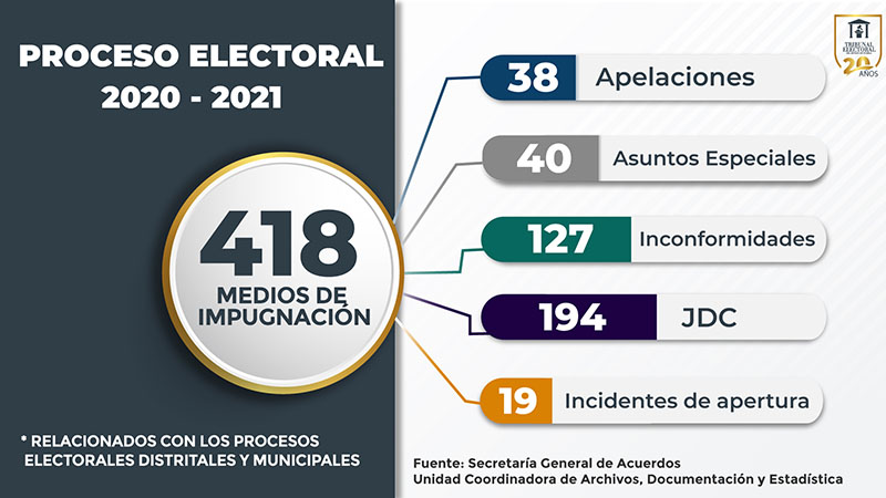 El Tribunal Electoral del Estado de Puebla resolvió 418 medios de impugnación relacionados con el Proceso Electoral Ordinario 2020-2021 y se concluyó con la etapa de Resultados y Declaración de Validez de las Elecciones a través de 45 sesiones públicas.