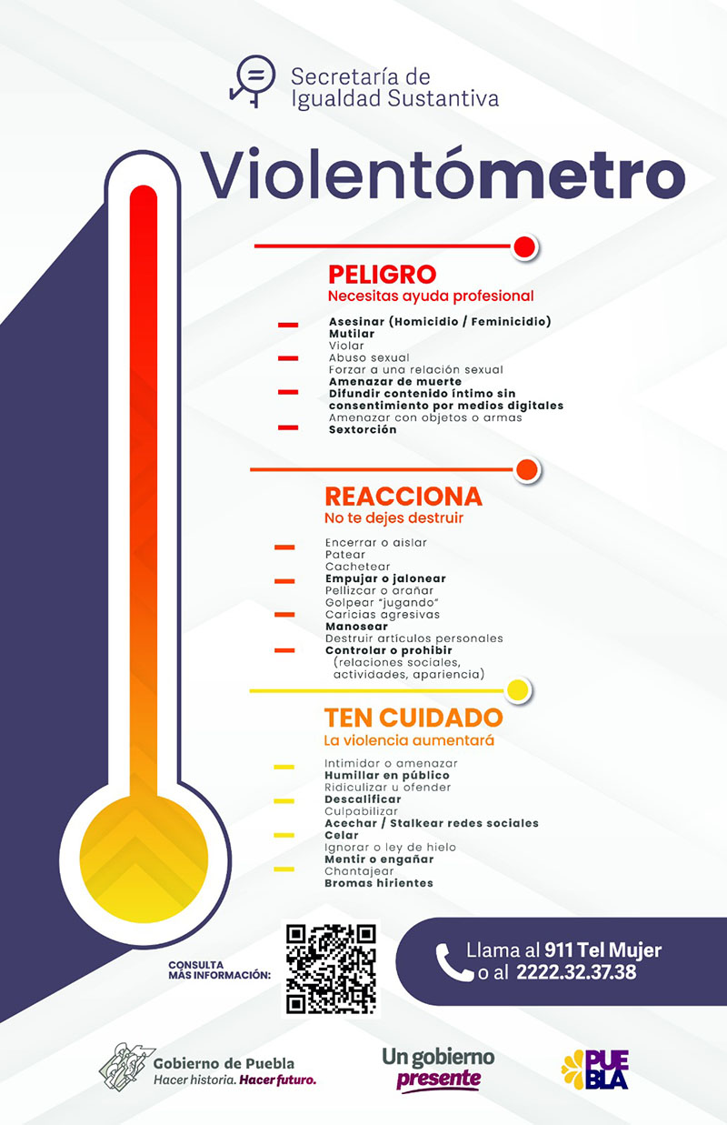 Cabe señalar que una de las metas de la actual administración es prevenir mediante la difusión de materiales informativos, acciones de violencia que puedan escalar en situaciones de mayor riesgo, por lo que, brindando la atención en sus diversos canales, la SIS convoca a la población a conocer el “Violentómetro”, el cual podrán encontrar en la página web: sis.puebla.gob.mx, y a través de las redes sociales Facebook y Twitter: @IgualdadGobPue.