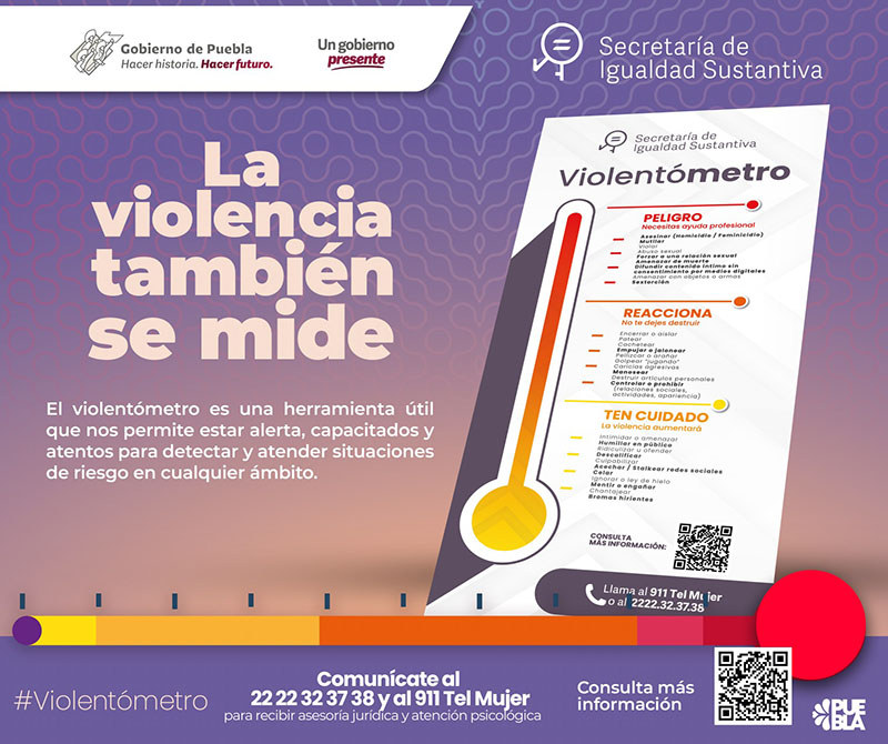 Mediante la difusión y reeducación preventiva en los distintos espacios sociales, el gobierno presente de Sergio Salomón busca que las poblanas y poblanos cuenten con las herramientas para identificar y prevenir actitudes violentas en cualquier contexto, por lo que, a través de la Secretaría de Igualdad Sustantiva (SIS), difunde el “Violentómetro”, una herramienta gráfica que ofrece información precisa para atender, disminuir y erradicar acciones que pongan en riesgo la integridad de las ciudadanas y ciudadanos.