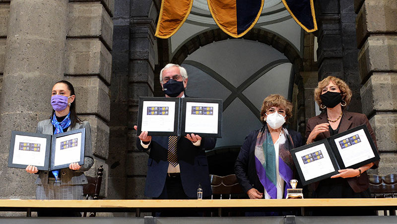 En el patio principal del Palacio de Minería, el rector canceló el timbre postal conmemorativo a los 100 años del escudo y lema universitarios, acompañado de Sheinbaum Pardo y la secretaria de Educación, Ciencia, Tecnología e Innovación de la Ciudad de México, Rosaura Ruiz Gutiérrez.